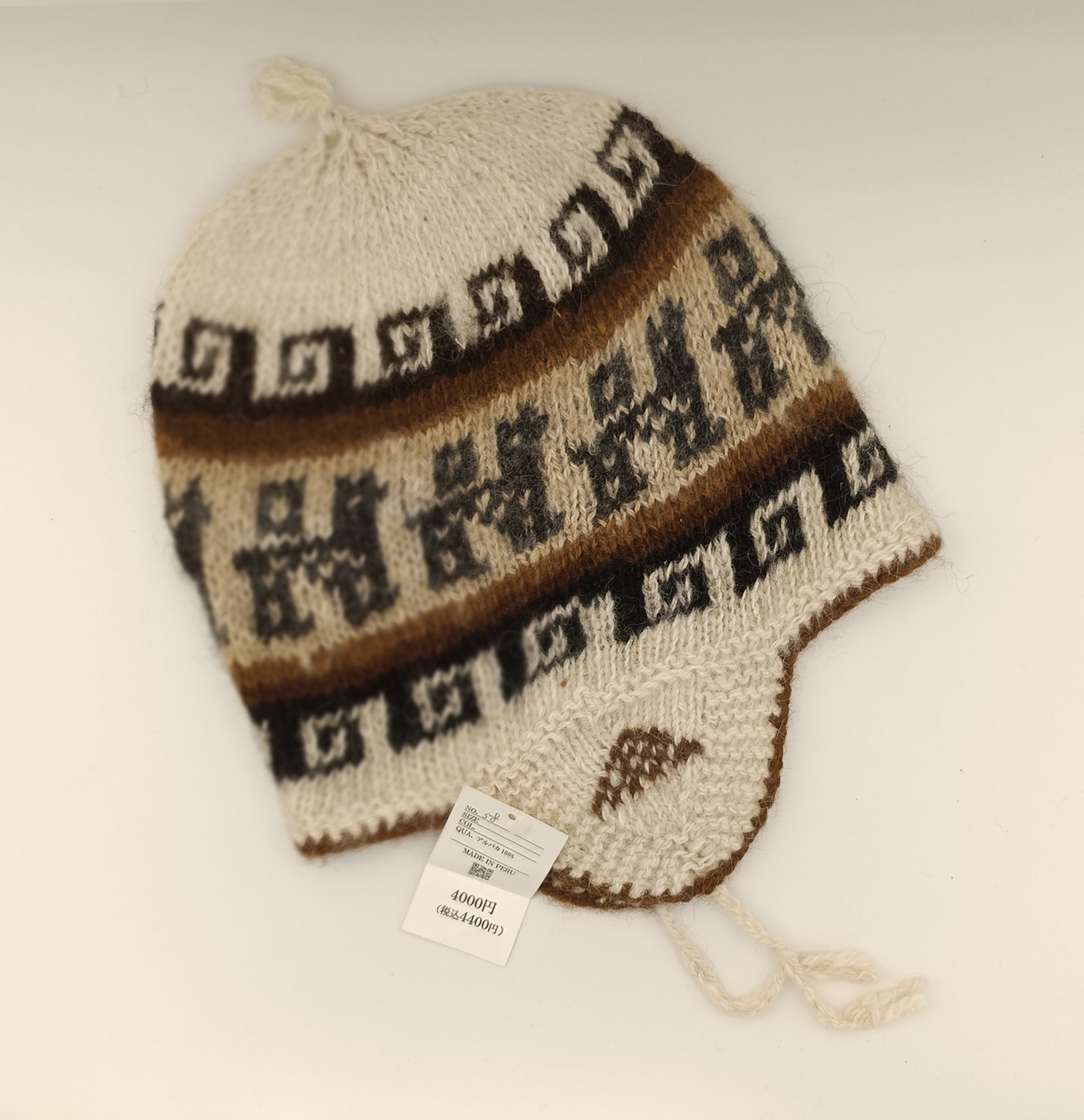 軽くて暖かい手編みのアルパカ帽子。貴重なアルパカ100%の糸のみで作られた贅沢な逸品です。耳当て付き。