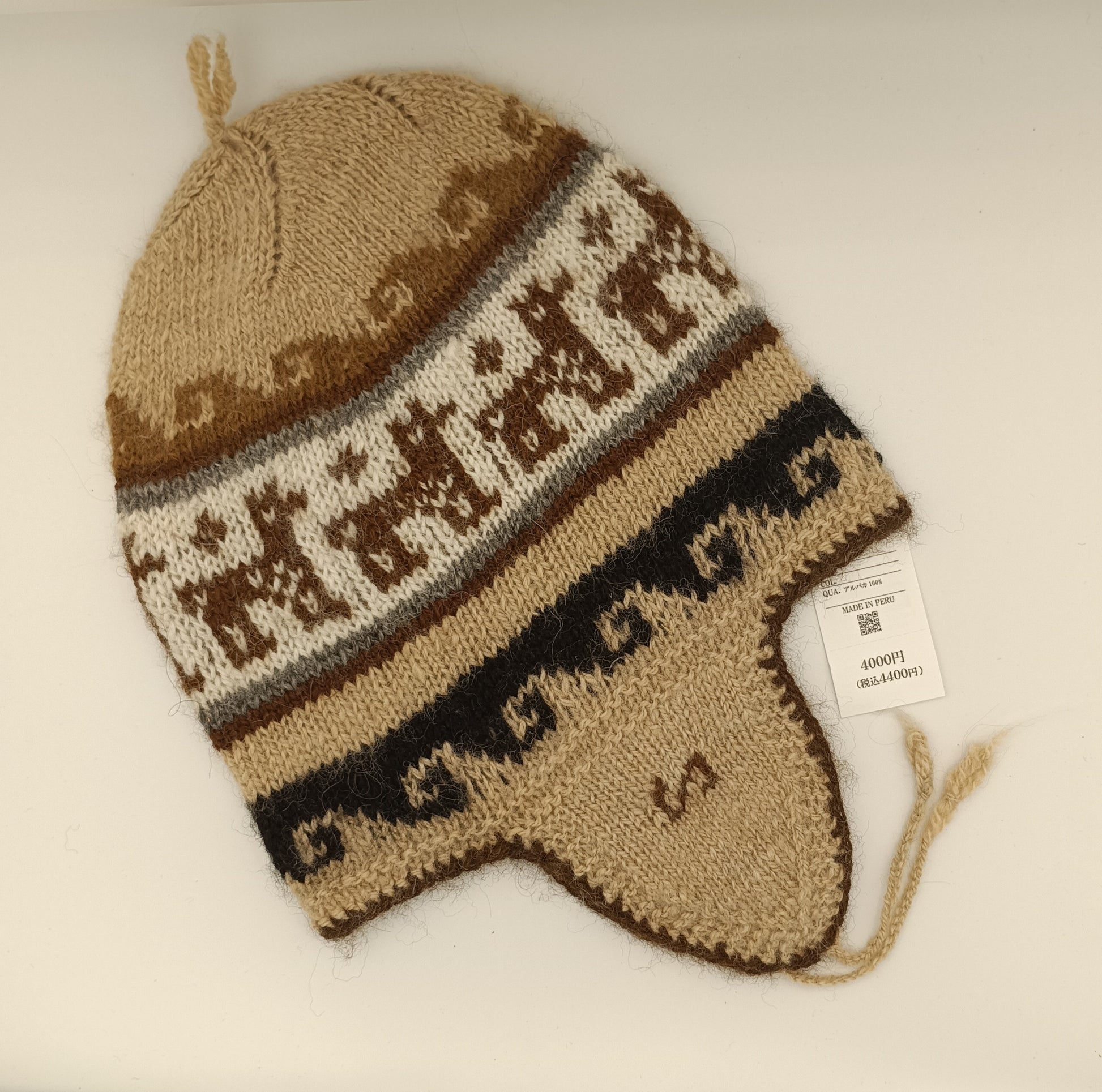 軽くて暖かい手編みのアルパカ帽子。貴重なアルパカ100%の糸のみで作られた贅沢な逸品です。耳当て付き。