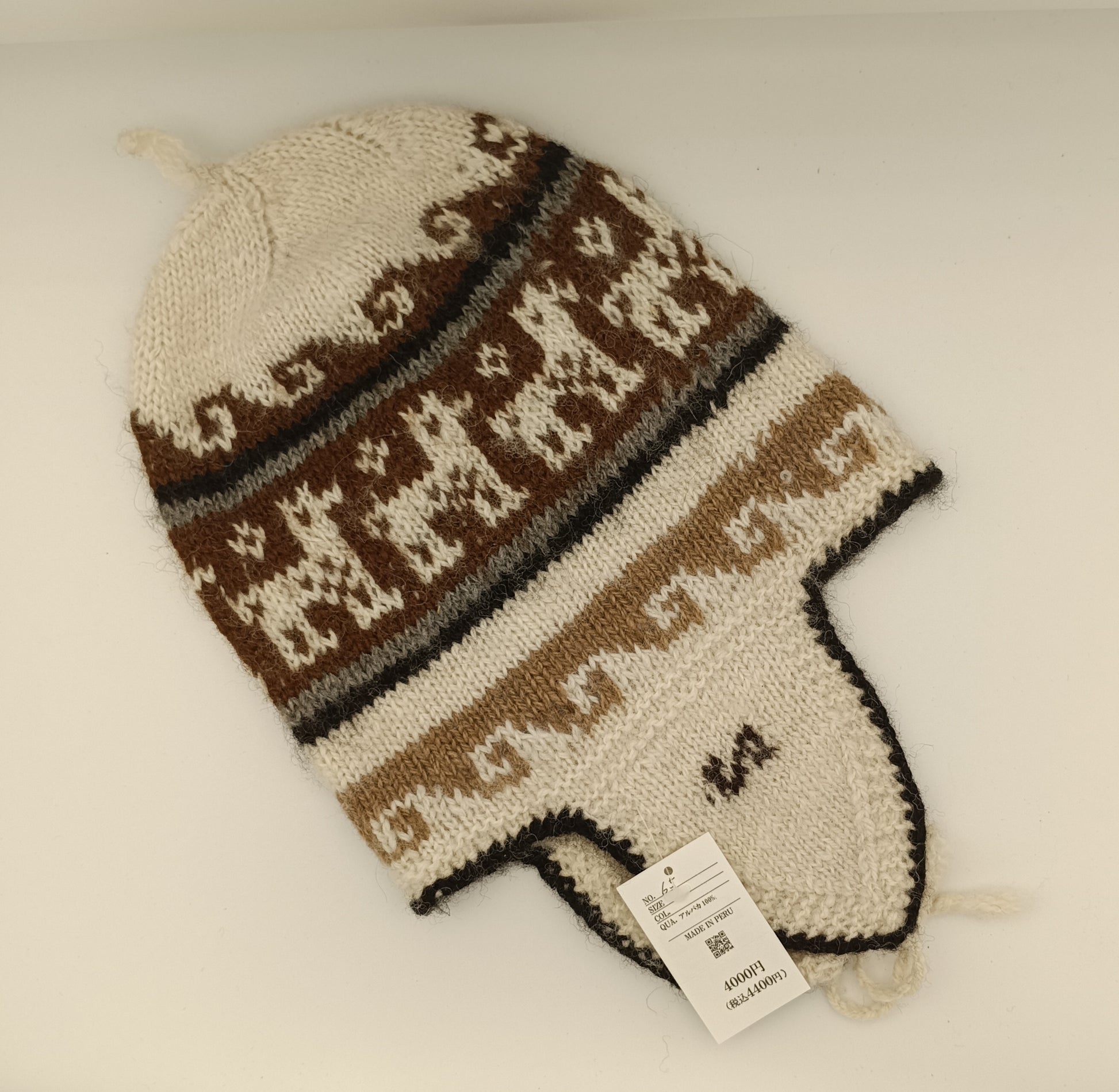 軽くて暖かい手編みのアルパカ帽子。貴重なアルパカ100%の糸のみで作られた贅沢な逸品です。耳当て付き。